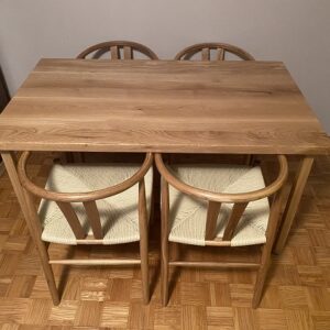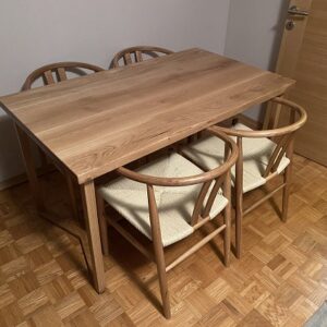 Trpezarijski sto izrađen od punog hrastovog drveta, sa pločom dimenzija 150 × 80 cm i standardnom visinom od 75 cm. Ploča debljine 4 cm tretirana je mat poliuretanskim lakom koji naglašava prirodnu teksturu drveta i obezbeđuje trajnu zaštitu površine.Konstrukciju čine drvene nogare precizno obrađene CNC tehnologijom, što omogućava čistu geometriju i stabilnost celine. Proporcije između masivne ploče i nogara stvaraju uravnotežen vizuelni odnos bez dodatnih dekorativnih elemenata.Ovaj sto predstavlja primer prethodne izrade po meri klijenta i služi kao referenca za buduće projekte sličnog karaktera.