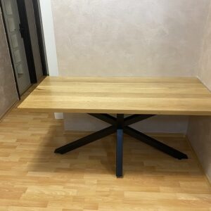 Trpezarijski sto izrađen od punog drveta trešnje, sa metalnim nogarama u crnoj mat završnoj obradi. Ploča dimenzija 150 × 90 cm, debljine 4 cm, zaštićena je poliuretanskim lakom u mat izvedbi koji naglašava prirodnu teksturu drveta.Konstrukcija počiva na metalnim nogarama kvadratnog profila 60 × 60 mm, završenim crnim mat premazom 3u1. Visina stola od 75 cm i odnos masivne drvene ploče prema čeličnoj podkonstrukciji stvaraju uravnotežen vizuelni izraz.Prikazan projekat predstavlja primer prethodne izrade po meri klijenta i služi kao referenca.