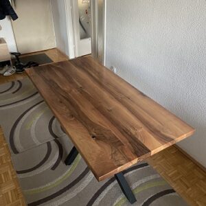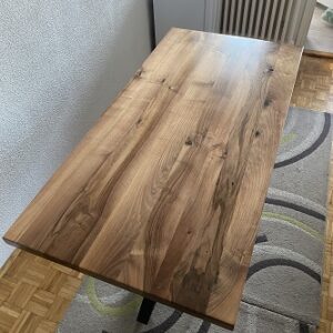 Trpezarijski sto izrađen od parenog oraha, sa metalnom podkonstrukcijom u crnoj mat završnici.Ploča dimenzija 160 × 80 cm postavljena je na radnoj visini od 75 cm. Površina parenog oraha zaštićena je poliuretanskim lakom u mat izvedbi, što naglašava prirodan ton drveta i omogućava dugotrajnu upotrebu.Konstrukcija počiva na metalnim nogarama kvadratnog profila 60 × 60 mm, završenim crnim mat premazom 3u1. Odnos masivne drvene ploče i geometrijske čelične osnove formira uravnoteženu celinu bez dodatnih elemenata.Prikazan projekat predstavlja primer prethodne izrade po meri klijenta.