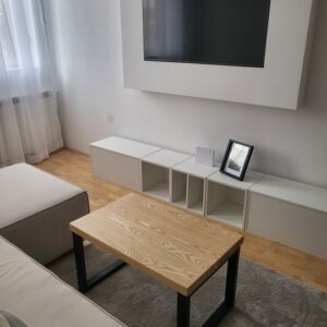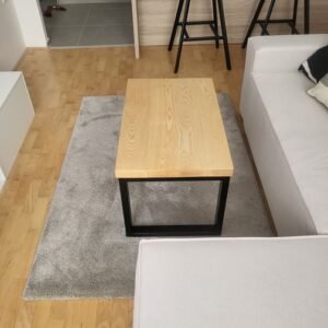 Klub sto izrađen od punog jasena, sa metalnim nogarama u crnoj mat završnici.Ploča debljine 4 cm, dimenzija 80 × 50 cm, zaštićena je mat poliuretanskim lakom koji naglašava prirodnu teksturu drveta. Visina stola od 45 cm odgovara funkciji niskog klub stola, prilagođenog sedećim grupama.Konstrukcija počiva na metalnim nogarama od pravougaonih cevi profila 50 × 30 mm, završenih crnom mat bojom 3u1. Kontrast između topline jasena i hladnoće metala uspostavlja vizuelnu ravnotežu bez dekorativnih dodataka.Prikazan projekat predstavlja primer prethodne izrade po meri klijenta i služi kao referenca.