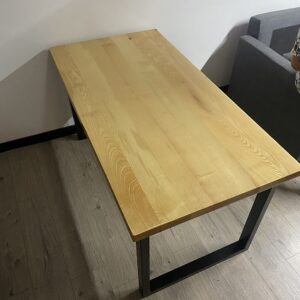 Trpezarijski sto izrađen od hrastovog drveta sa metalnom podkonstrukcijom. Ploča je obrađena u bajc tehnici i zaštićena mat poliuretanskim lakom.Dimenzije stola su 160 × 80 cm, sa visinom od 75 cm. Ploča debljine 4 cm pruža stabilnost i vizuelnu prisutnost, dok mat završna obrada naglašava prirodnu teksturu drveta.Konstrukcija počiva na metalnim nogarama od kvadratnog profila 60 × 60 mm. Odnos masivne hrastove ploče i čeličnog okvira stvara uravnotežen kontrast između organskog i industrijskog.Prikazan projekat predstavlja primer prethodne izrade po meri klijenta.