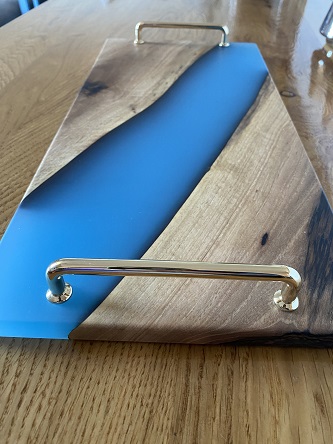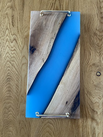 Drvena tacna izrađena od punog oraha, sa ulivom providne epoxy smole koji prati prirodnu ivicu drveta.