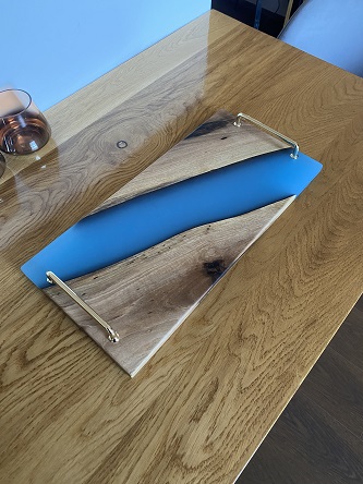Tacna je oblikovana kao funkcionalan predmet za serviranje, ali i kao samostalan dekorativni element. Kontrast između tamnog oraha i transparentne smole definiše formu bez dodatnih intervencija.