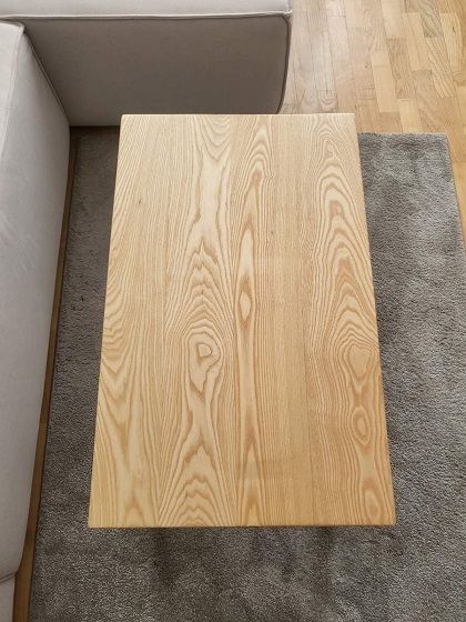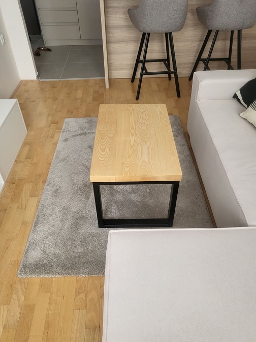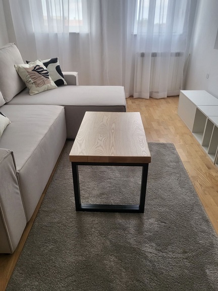 Konstrukcija počiva na metalnim nogarama od pravougaonih cevi profila 50 × 30 mm, završenih crnom mat bojom 3u1. Kontrast između topline jasena i hladnoće metala uspostavlja vizuelnu ravnotežu bez dekorativnih dodataka.