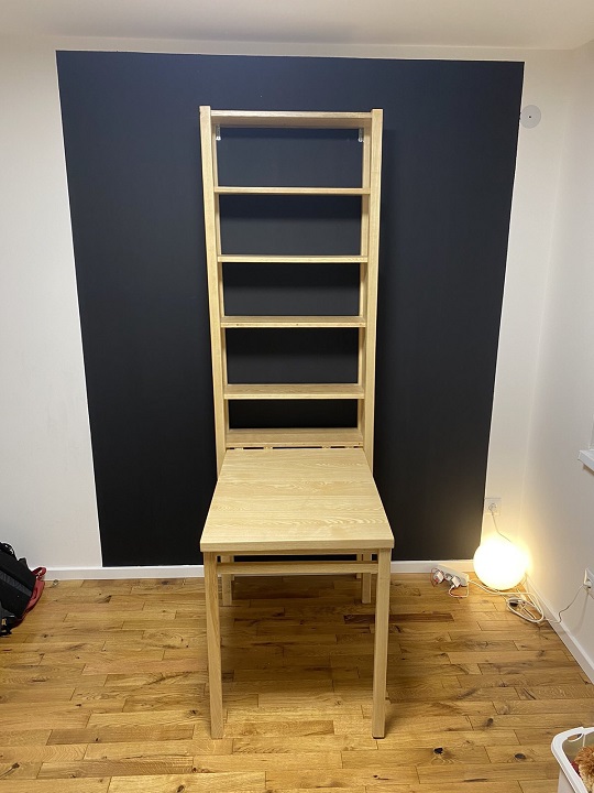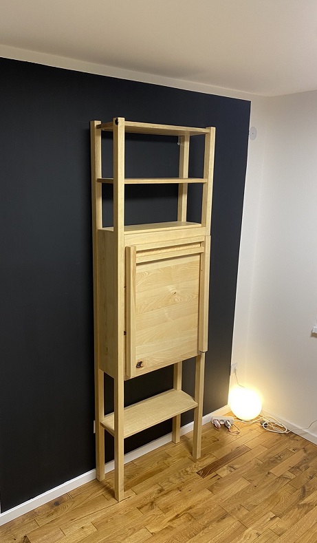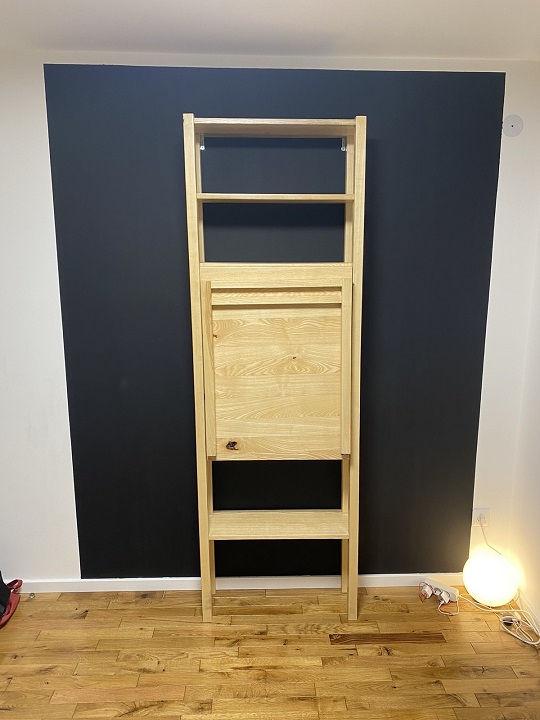 Polica dimenzija 70 × 25 cm dostiže visinu od 230 cm, dok je radna površina stola formirana u dimenzijama 80 × 70 cm. Ploče debljine 4 cm zadržavaju prirodnu masivnost drveta, a završene su matiranim poliuretanskim lakom koji naglašava strukturu jasena bez dodatnog sjaja.