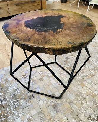 Ploča prečnika 55 cm izrađena je sa debljinom od 6 centimetara i zaštićena matnim poliuretanskim lakom koji naglašava prirodnu teksturu drveta i transparentnost smole. Visina stola od 45 centimetara odgovara funkciji night stola ili povremenog pomoćnog elementa u prostoru.