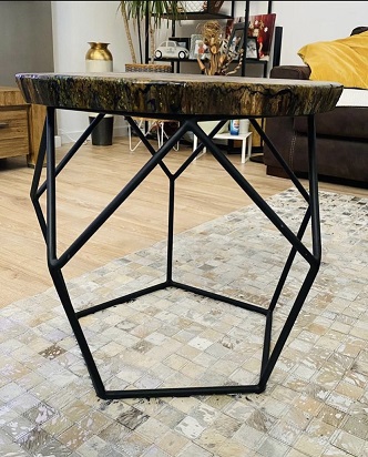 Okrugli pomoćni sto sa pločom od oraha i epoxy smole, postavljen na metalnu konstrukciju s matnom crnom završnom obradom.