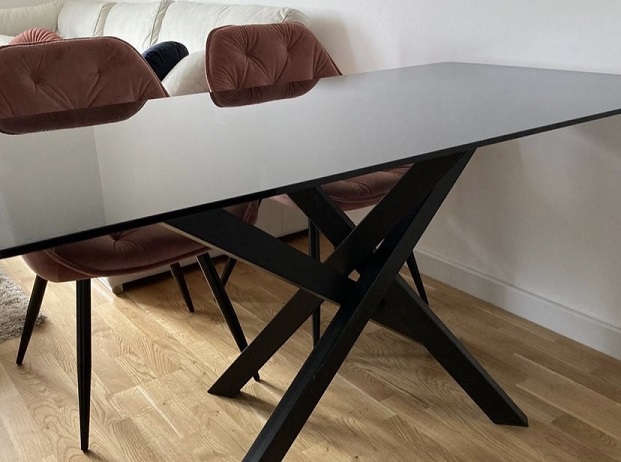 Trpezarijski sto sa pločom od kaljenog stakla i metalnom podkonstrukcijom, izrađen po meri za konkretnu prostoriju.