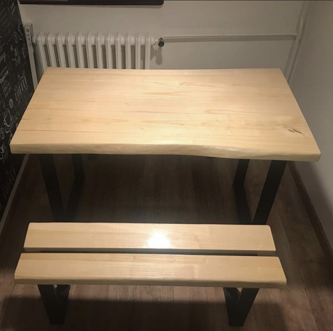 Konstrukcija počiva na metalnim nogarama od pravougaonih cevi profila 50 × 20 mm, završenih mat crnim premazom 3u1. Visina stola od 75 cm obezbeđuje standardne proporcije za trpezarijski prostor. Uz sto je izrađena i klupa dimenzija 100 × 27 cm, visine 45 cm, koja prati isti materijalizacioni i vizuelni jezik.