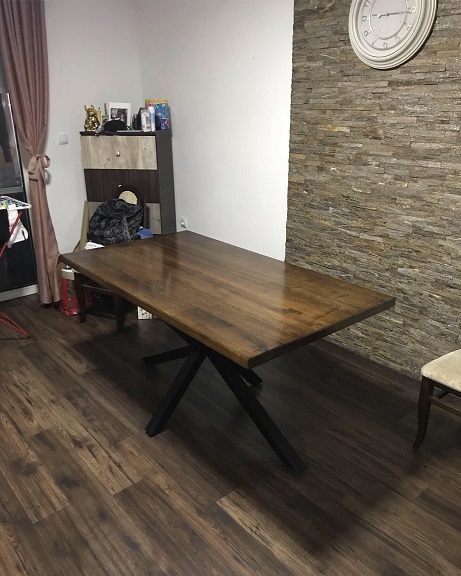 Trpezarijski sto izrađen od parenog oraha, sa metalnom podkonstrukcijom u crnoj mat završnici.