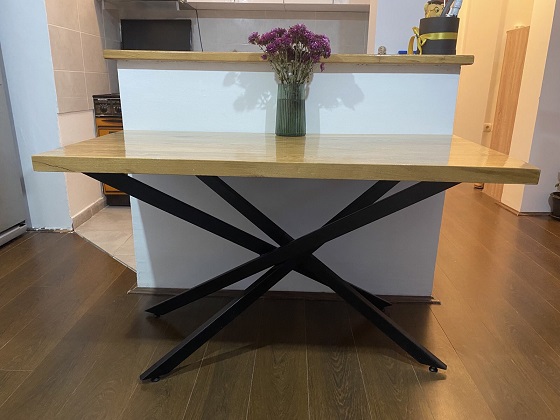 Konstrukcija počiva na metalnim nogarama od pravougaonih cevi profila 50 × 30 mm, završenih mat crnim premazom. Kontrast između svetlog hrasta i tamnih nogara definiše vizuelnu ravnotežu komada, dok debljina ploče i proporcionalni odnos sa metalnim okvirom obezbeđuju stabilnost i prisutnost u prostoru.